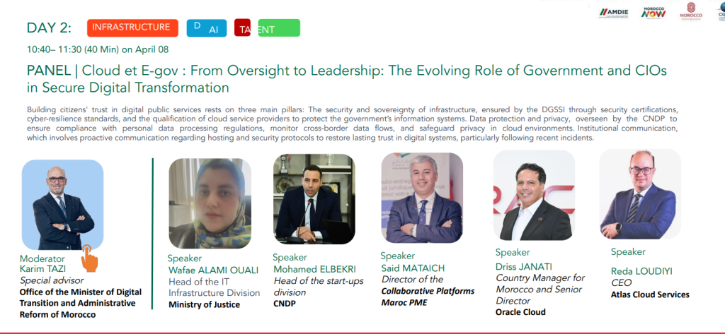 في إطار البرنامج المتميز الذي أعده رواق المغرب الرقمي ضمن فعاليات GITEX AFRICA MOROCCO 2026 و المخصص للفاعلين المؤسساتيين، قدم الدكتور محمد البكري، المشرف على قطاع المقاولات الناشئة باللجنة الوطنية لمراقبة حماية المعطيات ذات الطابع الشخصي (CNDP)، يوم 08 أبريل 2026، مداخلة ضمن ندوة’’ السحابة والحكومة الرقمية: من الإشراف إلى القيادة.. الدور المتطور للحكومة والمشرفين على نظم المعلومات في التحول الرقمي الآمن“، سلط فيها الضوء على التحديات المرتبطة بتدبير المعطيات في سياق التحول الرقمي.